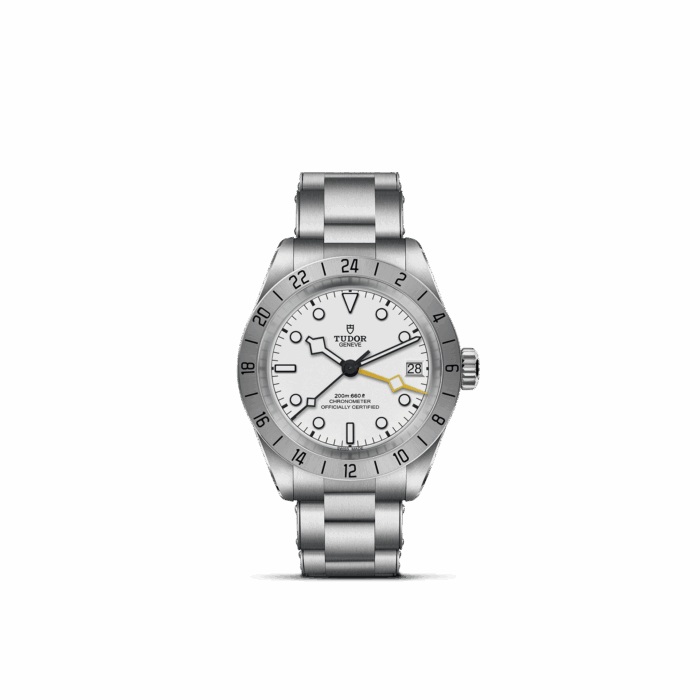 Black Bay Pro features a dual time zone function, a technical complication that establishes local time without losing sight of the time in another time zone. Compact, robust and sporty, this model boasts many unique aesthetic details and celebrates the spirit of the technical watches that TUDOR has produced for professionals throughout its history. Recognizable by its 24-hour graduated satin-brushed fixed bezel and its yellow 24-hour “Snowflake” hand, Black Bay Pro is powered by the TUDOR Manufacture Caliber MT5652 with built-in GMT function. This year sees an opaline dial join the range.