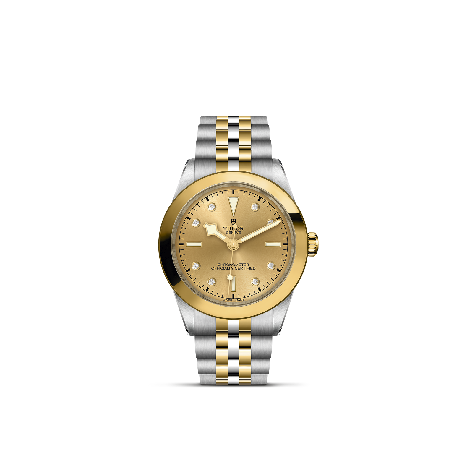 - Screw-down winding crown with the TUDOR rose in relief. Steel covered by a 0.1mm 18 ct yellow gold cap